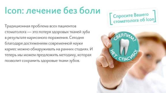 ICON – первый и единственный в мире инфильтрат (уплотнитель) кариеса. При нанесении специального материала активное вещество проникает глубоко в поры зубной ткани, заполняет их и полностью восстанавливает структуру зуба.